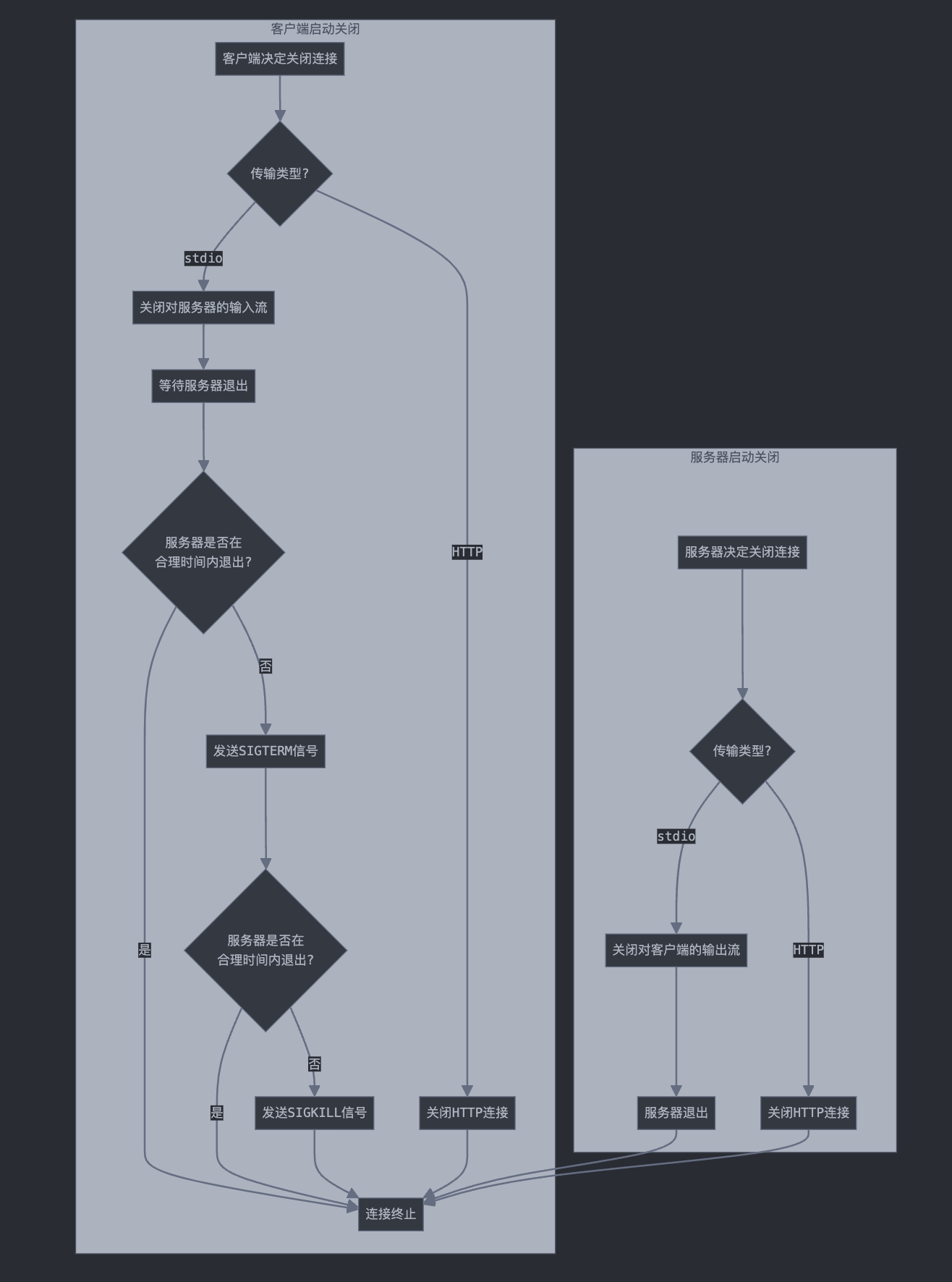 传输层(stdio 或 http)断开,客户端与服务器终止通信, 双方各自关闭连接。