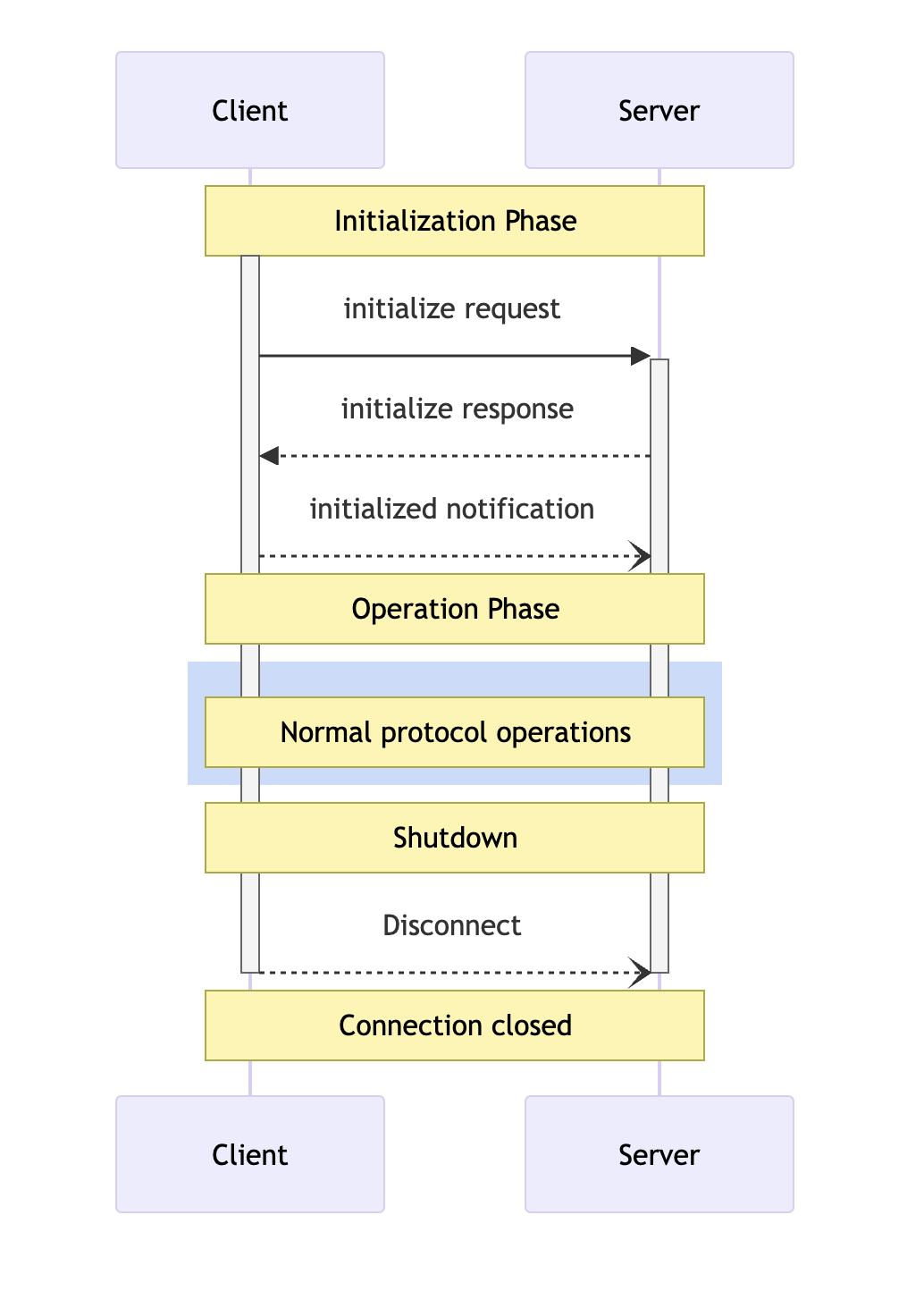 MCP 协议定义了一个严格的三阶段生命周期,用于管理客户端-服务器连接: